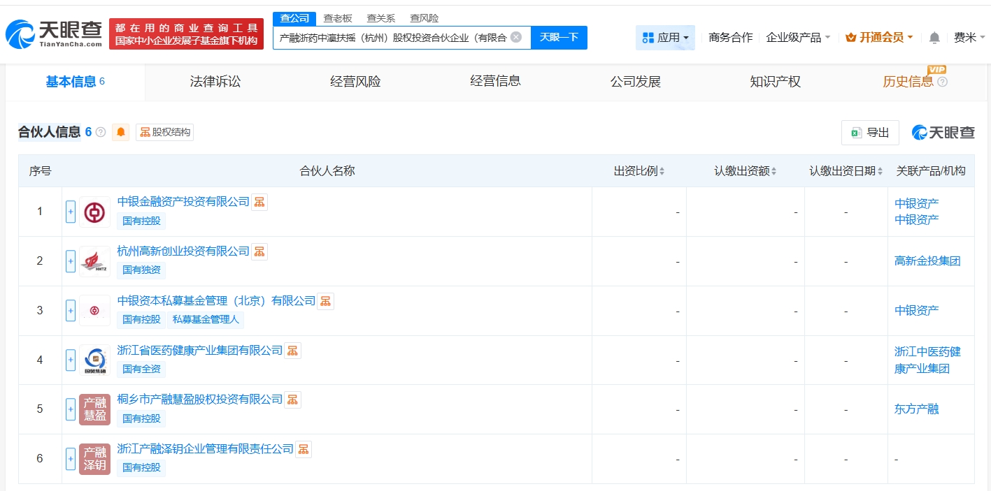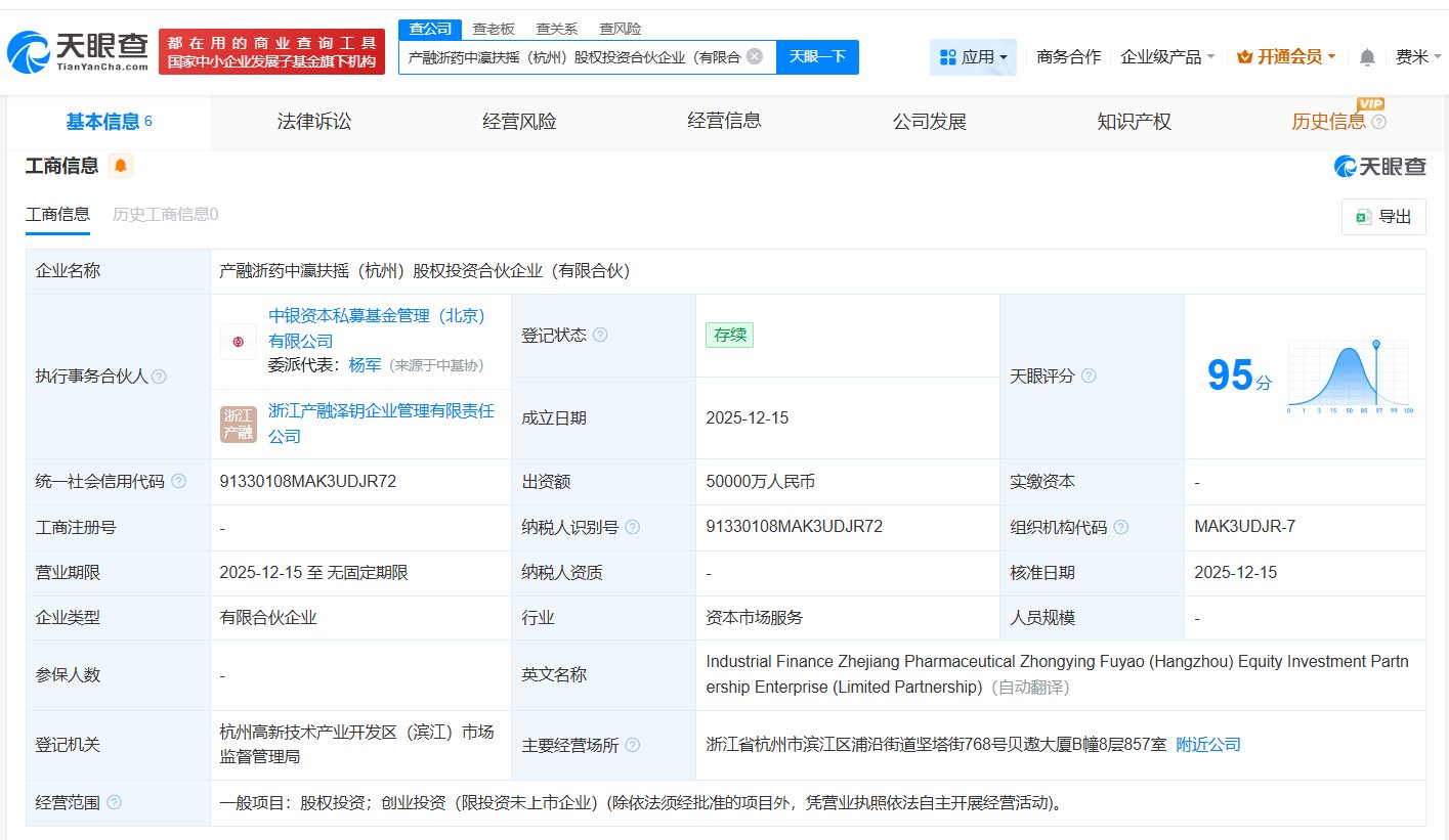 每经AI快讯,天眼查App显示,近日,产融浙药中瀛扶摇(杭州)股权投资合伙企业(有限合伙)成立,执行事务合伙人为中银资本私募基金管理(北京)有限公司、浙江产融泽钥企业管理有限责任公司,出资额5亿元人民币,经营范围为股权投资、创业投资,由中银金融资产投资有限公司、杭州高新创业投资有限公司、中银资本私募基金管理(北京)有限公司、浙江省医药健康产业集团有限公司、桐乡市产融慧盈股权投资有限公司、浙江产融泽钥企业管理有限责任公司共同出资。