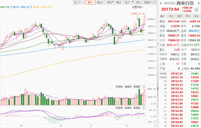 【环球网消费综合报道】在“扩大内需”被提升至战略高度的背景下,大消费板块12月16日迎来爆发式行情。商业百货率先领涨,永辉超市、百大集团(4连板)、欧亚集团、中央商场、广百股份、茂业商业等多股强势涨停,食品饮料、美容护理、旅游酒店等细分领域亦全面走强,市场做多热情被彻底点燃。