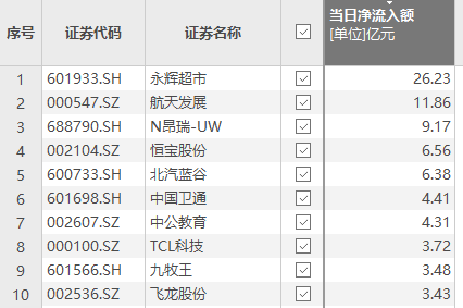 上证报中国证券网讯(记者 费天元)Choice数据显示,12月16日,资金净流入额排名前十的个股依次是永辉超市、航天发展、N昂瑞-UW、恒宝股份、北汽蓝谷、中国卫通、中公教育、TCL科技、九牧王、飞龙股份。其中,永辉超市获净流入26.23亿元,居全部A股首位。