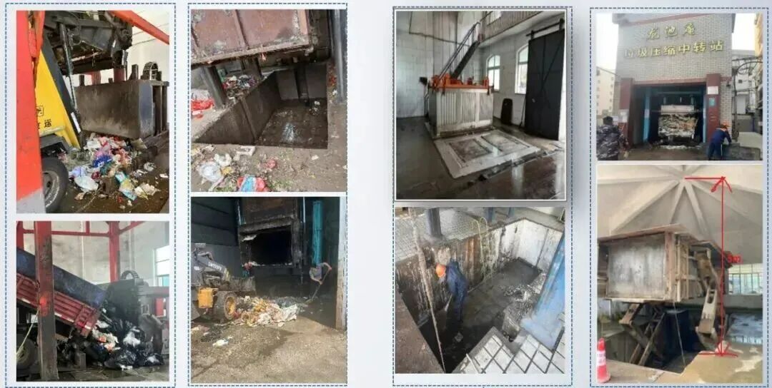 ▷大型设备与老旧站点的“空间博弈”:大吨位垃圾车与卸料口狭小的老旧站点形成 “大象进窄门” 的尴尬,作业拥堵、垃圾洒落、污水飞溅成常态。