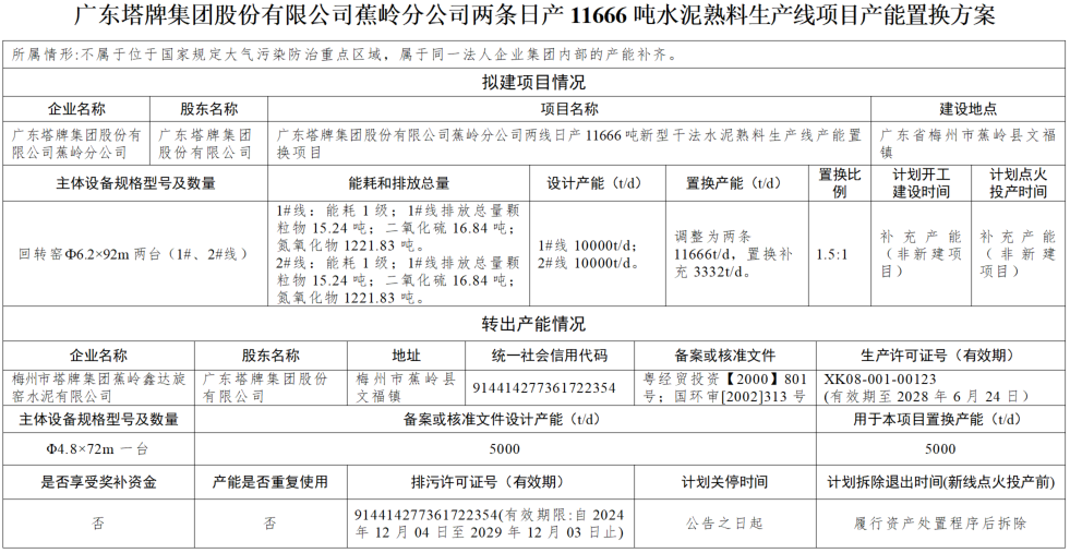 置换方案显示,塔牌集团蕉岭分公司1#、2#10000t/d生产线分别补充产能1666t/d,补充后两条生产线产能为11666t/d,退出产能来自塔牌集团蕉岭鑫达旋窑水泥公司一条5000t/d熟料生产线,置换比例1.5:1。