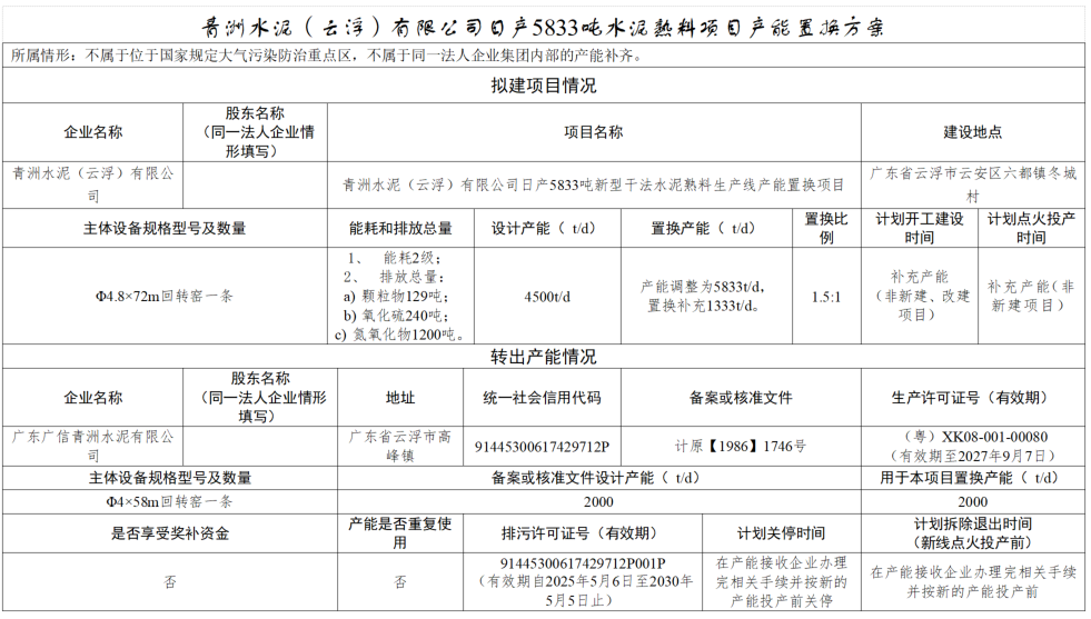 青洲水泥(云浮)一条4500t/d熟料生产线补充产能1333t/d,补充后产能5833t/d,退出产能来自广信青洲水泥一条2000t/d熟料生产线。
