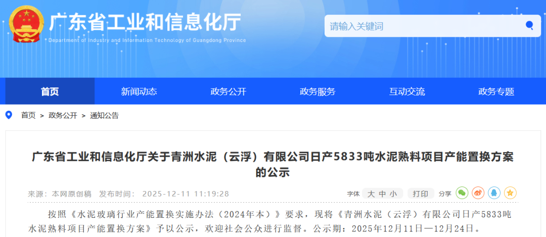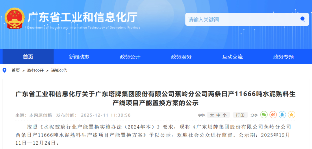 近日,广东省工信厅发布“广东塔牌集团股份有限公司蕉岭分公司两条日产11666吨水泥熟料生产线项目产能置换方案的公示”及“关于青洲水泥(云浮)有限公司日产5833吨水泥熟料项目产能置换方案的公示”。