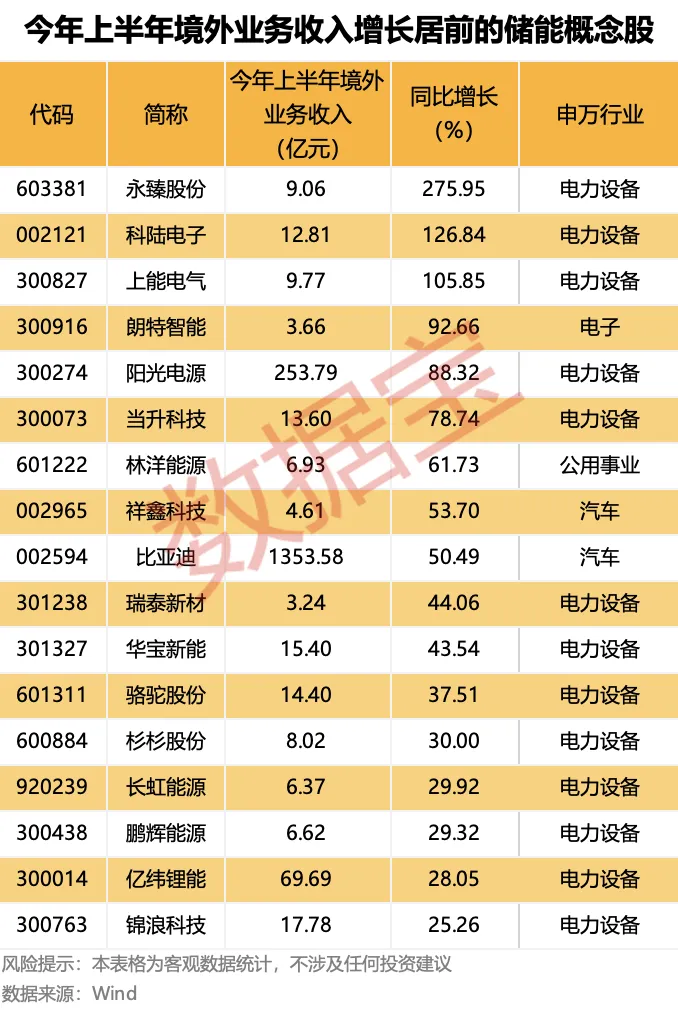 据证券时报·数据宝统计,A股布局储能业务的上市公司超过百家,2024年上半年境外业务收入超1亿元的56家公司中,有41家今年上半年境外业务收入实现同比增长,占比超70%。