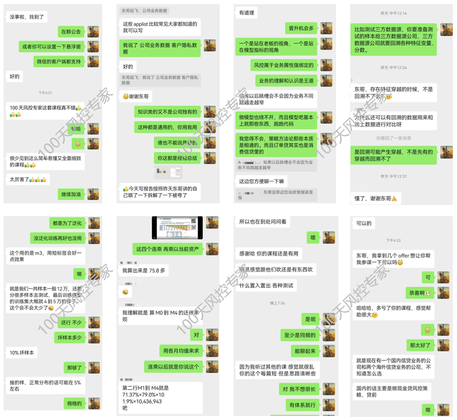 另外,课程学员近1000人,群里汇聚了市面上几乎所有做信贷业务的公司了,各个大厂、银行、消金、小贷、互金、融担、汽车金融、海外金融等等,非常多的业内大佬会在群里交流自己的新得和理解,绝对是一块宝藏的风控交流净土了。