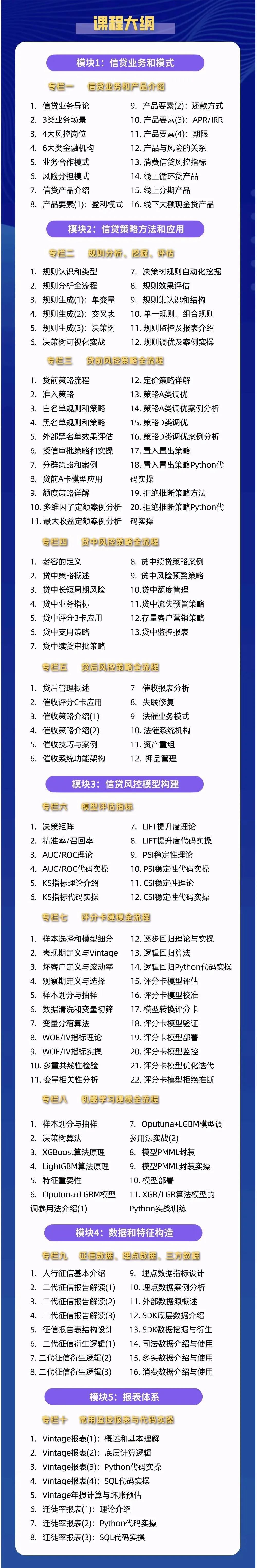 《100天风控专家》从0到1,全面介绍了信贷风控的各个环节,包括业务产品、策略、模型、数据报表、损益等”5大板块,10大专栏,150期“ 的视频课程,总课时约60h,平均每节20min,目前已更148期,下面是大纲。