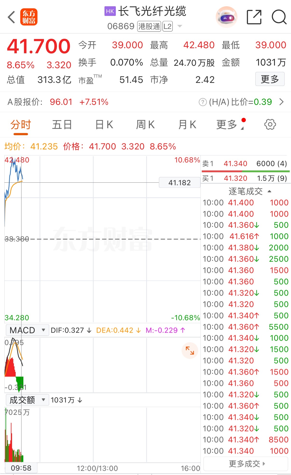 上证报中国证券网讯(林铭溱 记者 孔令仪)12月17日,长飞光纤光缆早盘一度涨超10%,最高报42.48港元/股。截至9时58分,长飞光纤光缆涨8.65%,报41.7港元/股,总市值约313.3亿港元。