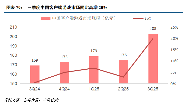 三季度中国客户端游戏市场同比高增20%。据伽马数据,三季度中国端游市场规模203亿元,同比增长20%,主要是因为暑期档多款产品的集中发力及双端互通产品的持续贡献。一方面是《三角洲行动》《燕云十六声》等多端互通产品贡献增量,另一方面是经典IP产品的长青运营,例如《梦幻西游》电脑版通过推出“畅玩服”等创新运营策略,在7—9月连续三个月同时在线人数创新高,为成熟产品注入新活力。
