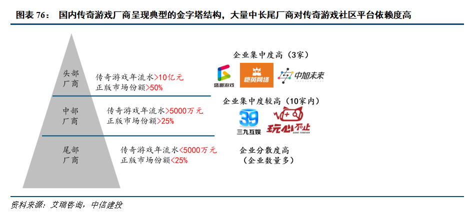 面向游戏开发者:成为大量中长尾传奇游戏的分发和获客渠道。国内传奇IP知名度高,传奇游戏受众也覆盖30岁以下年轻用户、30-50岁中年用户两大群体,因此市场规模大、需求多样化,足以容纳丰富的传奇游戏供给。国内传奇游戏开发者呈金字塔结构,头部公司主要是盛趣游戏、恺英网络、中旭未来三家,中部公司包括三九互娱、玩心不止等不足十家,尾部公司则数量多、分散度高,通过大量年流水低于5000万元的小体量游戏参与长尾市场竞争。由于这些尾部公司缺乏足够的宣发资金和宣发能力,垂直度高的传奇游戏平台就成为他们进行游戏测试、宣发的高性价比渠道。