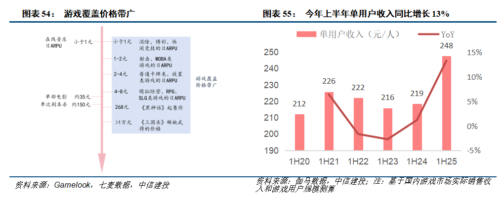 根据游戏工委数据测算,今年上半年单用户游戏收入同比增长13%。我们基于上半年国内游戏市场实际销售收入和用户规模测算,上半年单用户收入达248元,同比增长13%,绝对值和增速均创21年以来同期新高。我们认为增长的核心驱动力在于游戏的用户时长增加,用户愿意将更多休闲娱乐上的预算向游戏倾斜。