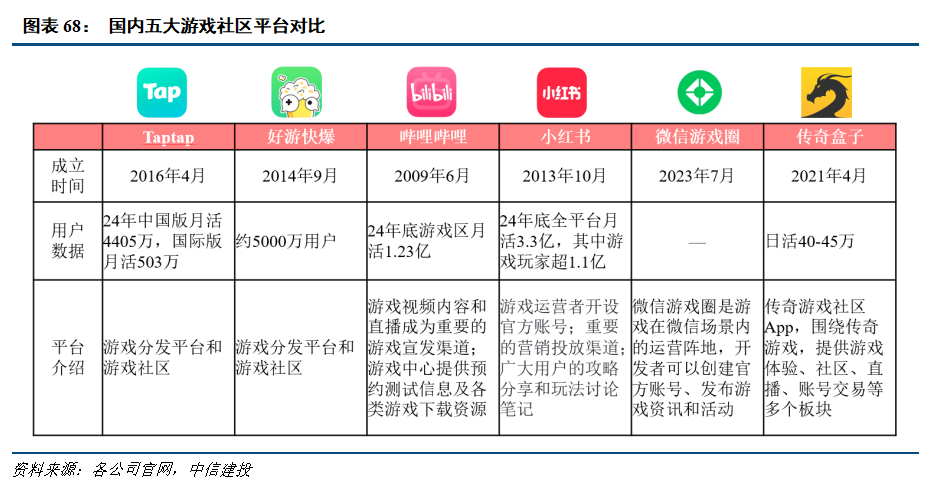 游戏用户侧活跃度高,国内游戏社区平台有望直接受益。当前国内主要的游戏社区平台包括TapTap、好游快爆、传奇盒子、小红书、哔哩哔哩和微信游戏圈。TapTap与好游快爆的模式类似,都定位为游戏分发渠道和游戏社区,但TapTap社区的活跃度更高、公信力更强。小红书和哔哩哔哩都是综合性的社区平台,既是用户分享游戏内容的平台,也是重要的内容营销投放渠道。微信游戏圈是微信23年新发布的板块,依托微信的高社交黏性,游戏运营者可以建立私域圈子,用户也可以看到其他好友发布的游戏动态。传奇盒子则聚焦传奇游戏赛道,提供游戏体验、社区、直播、账号交易等多个板块,目前日活40-45万。