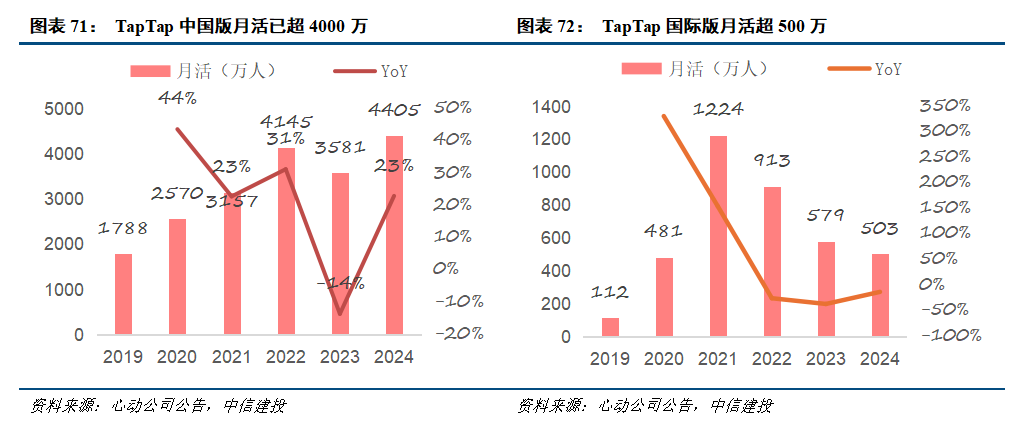 目前TapTap中国版月活呈现稳步增长趋势。TapTap中国版2024年月活为4405万,同比增长23%,2019-2024年CAGR达20%。2023年出现TapTap成立以来的首次下滑,主要是因为2017年8月上线的独家游戏《香肠派对》进入生命周期后期,用户活跃度降低,叠加疫情后用户线下活动恢复,线上游戏受挤压。2024年月活明显反弹并创新高,主要是因为《心动小镇》《铃兰之剑》等新游上线,吸引用户回流,其中独家发行游戏《心动小镇》在24年的下载次数超3000万次,成为24年TapTap下载量最高的游戏。