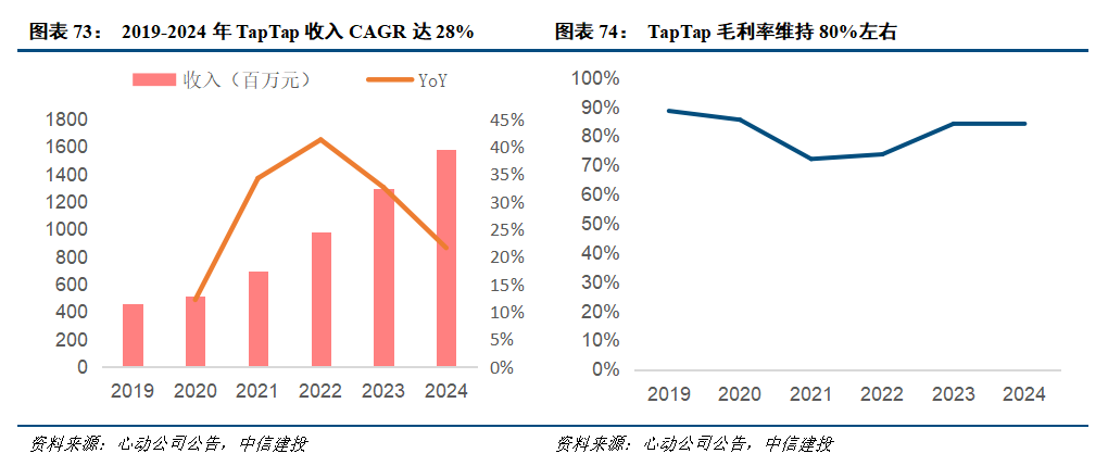 TapTap毛利率稳定在80%附近。TapTap的成本开支主要是带宽费用、服务器托管费和人员工资。2024年TapTap毛利率为84%,同比持平,2019-2024年毛利率平均为81%。2021-2022年毛利率仅72%和74%,主要是因为TapTap国际版、TapTap开发者服务(TDS)、TapTap云游戏等新业务产生成本开支,但尚未货币化。
