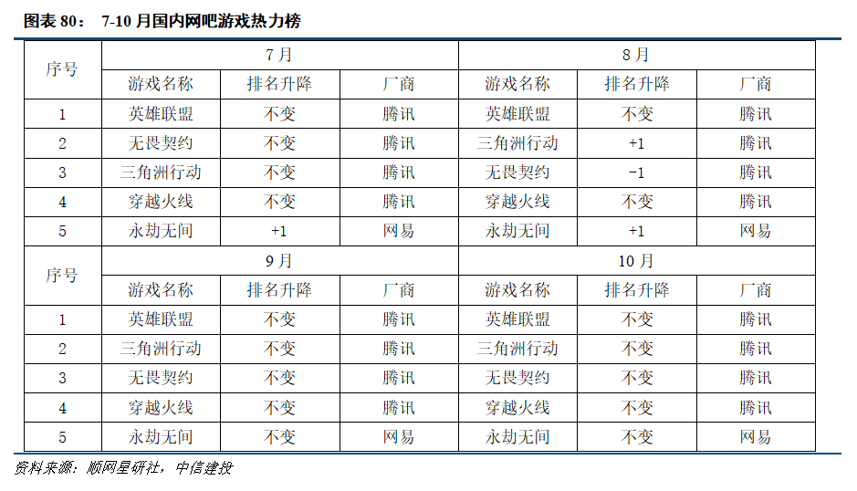从产品维度看,腾讯系大DAU重磅游戏的热度稳居前列。根据顺网星研社发布的网吧游戏热力榜,7-10月热度前三的游戏均为《英雄联盟》《无畏契约》《三角洲行动》三款,第四和第五均为腾讯《穿越火线》和网易《永劫无间》。其中长期稳定第一的《英雄联盟》已经脱离了纯粹的游戏属性,而是玩家在线下社交以外,在线上进行社交的一种补充,《无畏契约》《三角洲行动》《穿越火线》则是腾讯在FPS赛道进行深耕和长青运营的表现,通过高频更新和差异化的用户策略,共同做大FPS赛道。