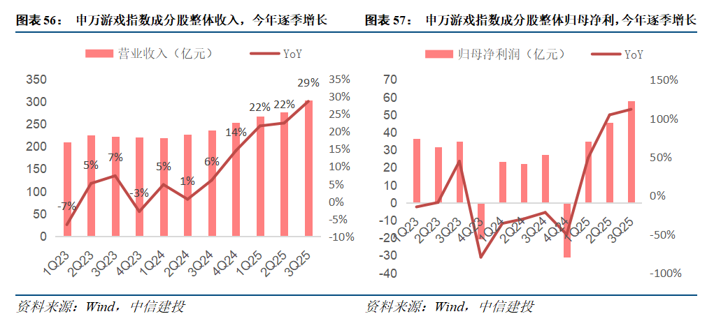 3)部分游戏公司通过投放调整,较大幅度减少销售费用率,驱动利润端实现两位数增长。与传统买量相比,KOL合作、内容营销等新营销方式的单次资金投入门槛更低,今年有新游戏上线的公司,销售费用率普遍没有出现大幅度的提升;部分聚焦老游戏运营的公司,也通过投放调整,较大幅度减少销售费用率。例如三七互娱一季度上线的新游戏《时光大爆炸》《英雄没有闪》在二季度减少投放,驱动二季度销售费用率47%,同比下降8pct,环比下降10pct;三季度销售费用率再度降低至45%,同比下降12pct,环比下降2pct。销售费用率下降驱动公司二三季度虽然没有大体量新品上线,但归母净利润仍维持20%以上的增速。贪玩25年上半年销售费用8.4亿元,同比下降63%,销售费用率42%,同比下降29pct,驱动上半年净利润同比扭亏为盈至6.5亿元(24年上半年是-3.8亿元)