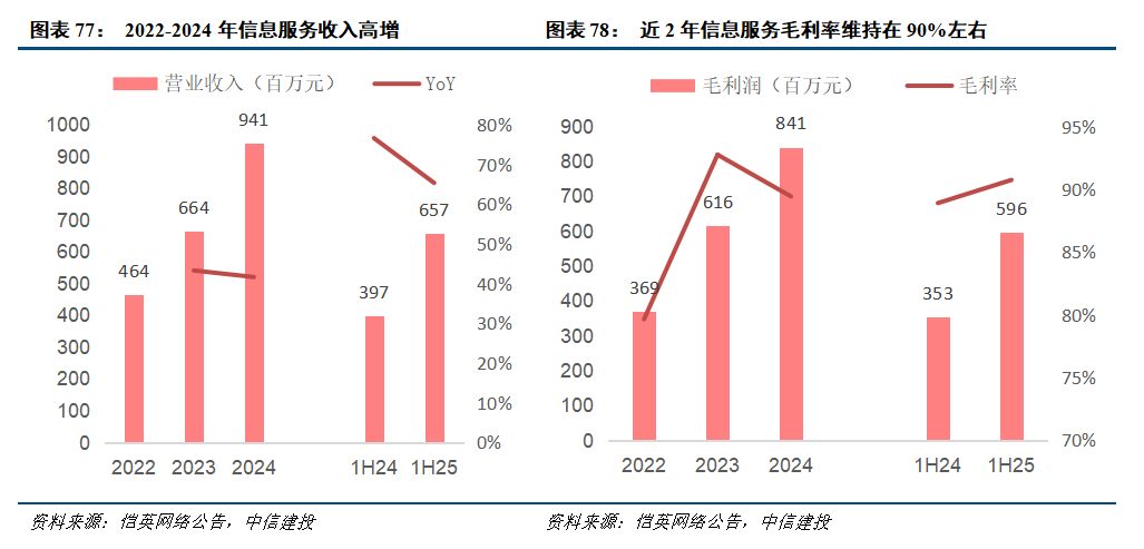 广告贡献主要收入,近3年收入快速增长。传奇盒子作为中长尾传奇游戏的分发和获客渠道,主要通过广告业务获得收入,在开屏、首页推荐板块、社区顶端等地方均设置了广告位。此外还获得直播打赏、游戏充值的流水分成。作为恺英网络运营的平台,相关收入记在上市公司的“信息服务”中(该项目收入主要来自传奇盒子,少部分来自精品发行平台XY.COM)。上半年信息服务收入6.6亿元,同比增长65.3%,占收入比例25.5%,同比增加9.9pct。22-24年信息服务收入增速CAGR已达27%,今年上半年在高基数下继续大幅增长65.3%。