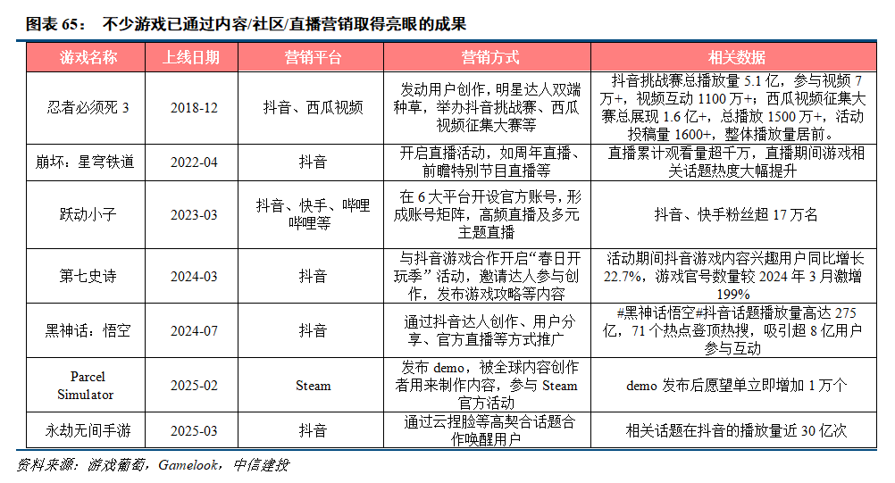游戏宣发形式多样化,内容/社区/直播营销的占比提升。随着传统买量成本持续增加,游戏公司对买量投放的ROI管控趋于严格,以及年轻一代游戏用户越来越倾向于通过抖音、小红书等社交平台获取资讯,传统买量占比下降,内容/社区/直播营销的份额在提升。虽然还没有第三方数据准确统计不同营销方式的预算占比,但我们可以从三个角度验证这一趋势: