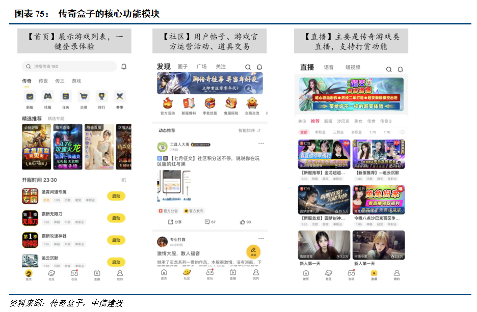1)通过平台直接启动各类传奇游戏,多端互通体验好。中长尾传奇游戏数量多、玩法差异大,通过游戏平台,用户可以直接在线开启游戏,无需逐一下载。且与其他平台的游戏引擎相比,传奇盒子搭载自研第六代传奇引擎,具有稳定性高、时延低、Windows/Android/iOS全平台数据实时互通的特点,游戏体验较好。