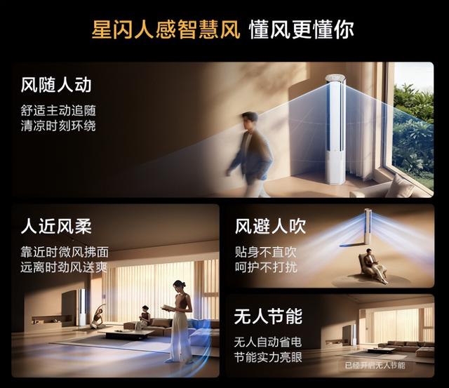 人近风柔,无人节能:检测到有人靠近时,自动切换柔和风速,防止直吹;室内长时间无人,则自动进入节能模式,实现全程无感智能管理。