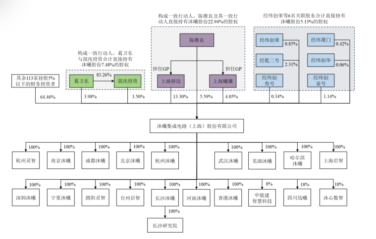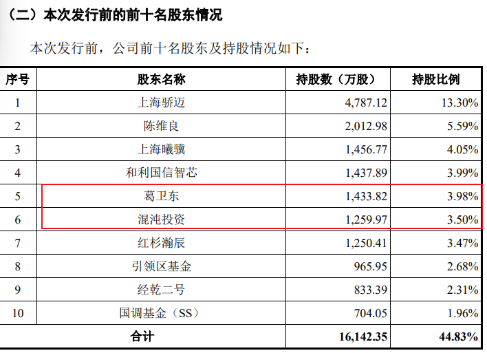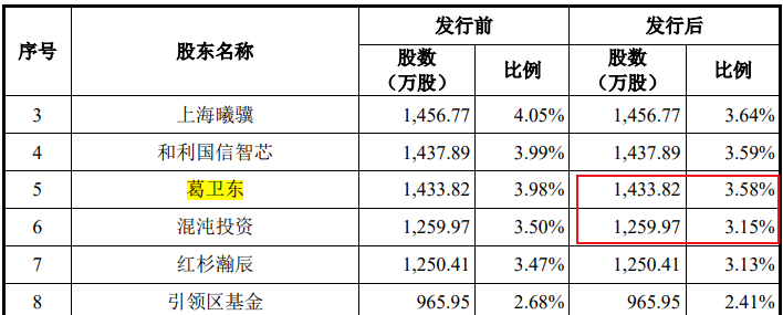 据招股书显示,葛卫东不仅自己直接持股1433.82万股,还通过混沌投资持有1259.97万股。招股书披露,葛卫东直接持有混沌投资83.26%股权,由此间接持有沐曦股份2.91%股份。也就是说,葛卫东个人共约持有沐曦6.89%股份,约2482.87万股份。