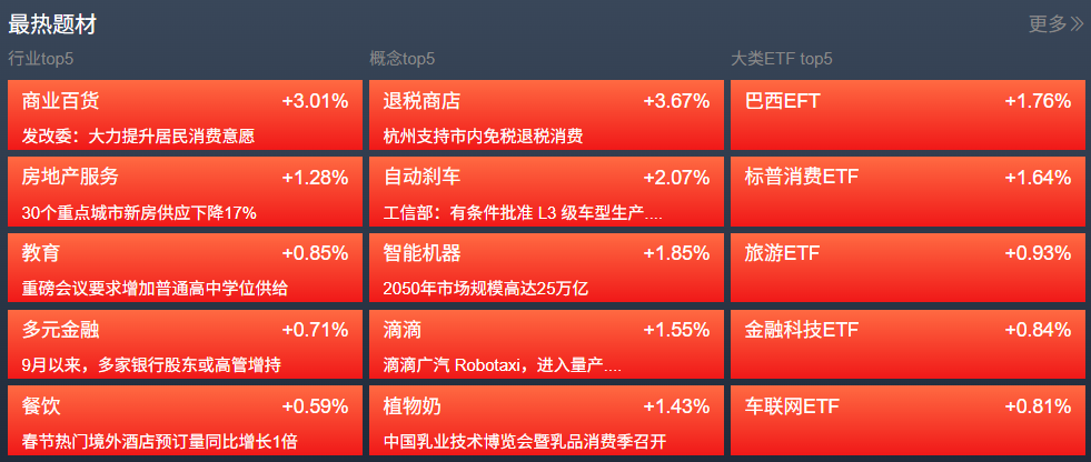 日本央行加息在即,导致亚太市场普跌,拖累A股调整。结构上看,近期中央关于大力提振消费的相关消息不断,刺激了大消费赛道;我国首批L3自动驾驶车型获准上路,叠加特斯拉启动无安全员Robotaxi路测,无人驾驶概念逆市大涨;三部门发文鼓励有条件的地方运用数字人民币智能合约红包提升促消费政策实施质效,数字货币相关概念盘中拉升。
