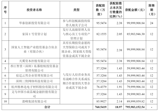 其中,华泰创新投资有限公司认购1亿,家园 1 号资管计划认购8598万元,国家人工智能产业投资基金合伙企业(有限合伙)、天翼资本控股有限公司分别认购1亿元,香江智景(深圳)私募股权投资基金管理有限公司、宿迁云邦企业管理有限公司、深圳三快网络科技有限公司分别认购6000万元,杭州格林达电子材料股份有限公司认购8000万,义乌中国小商品城金融控股有限公司认购6000万元,盈峰集团有限公司认购9000万元。