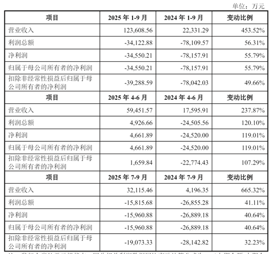 沐曦2025年前9个月营收为12.36亿元,较上年同期的2.23亿元增长453.52%;净亏损为3.46亿元,上年同期的净亏损为7.82亿元;扣非后净亏损为3.92亿元,上年同期的扣非后净亏损为7.8亿元。