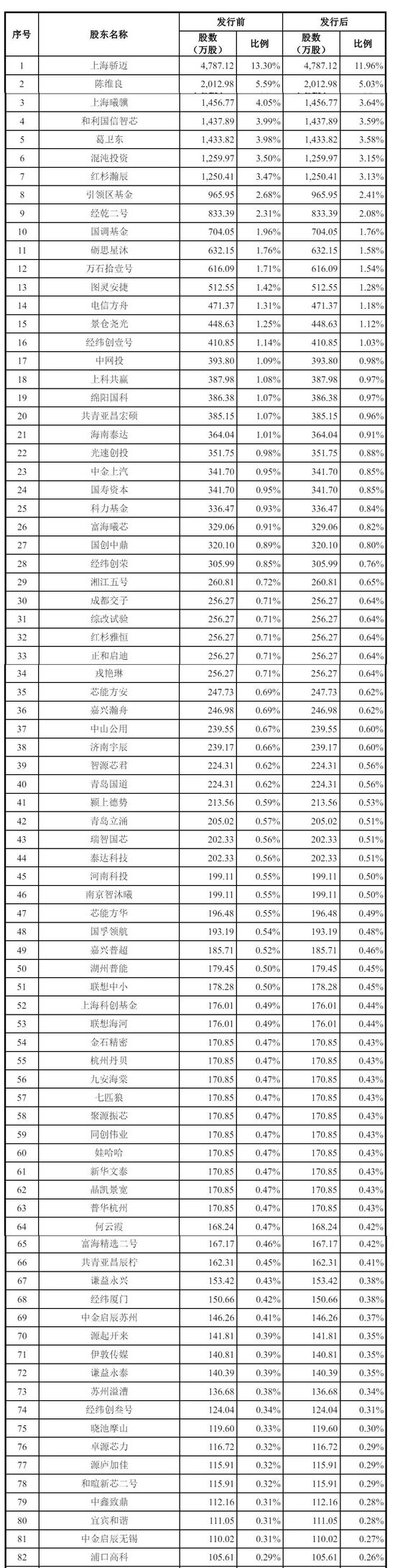 IPO后,上海骄迈持股为11.96%,陈维良持股为5.03%,上海曦骥持股为3.64%,和利国信智芯持股为3.59%,葛卫东持股为3.58%,混沌投资持股为3.15%,红杉瀚辰持股为3.13%,引领区基金持股为2.41%,经乾二号持股为2.08%,国调基金持股为1.76%,砺思星沐持股为1.58%;