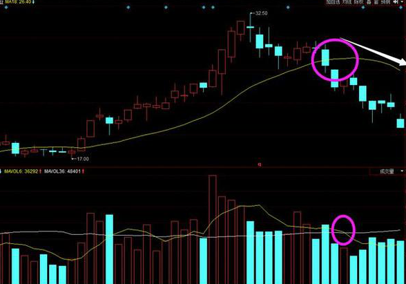 2.波段卖出:在股价上涨趋势中,K线连续三天收盘价跌破18日均线,并且18日均线由向上转为向下或走平,同时 量能均线 6日均量 死叉下穿36日均量,则为卖出信号。如图: