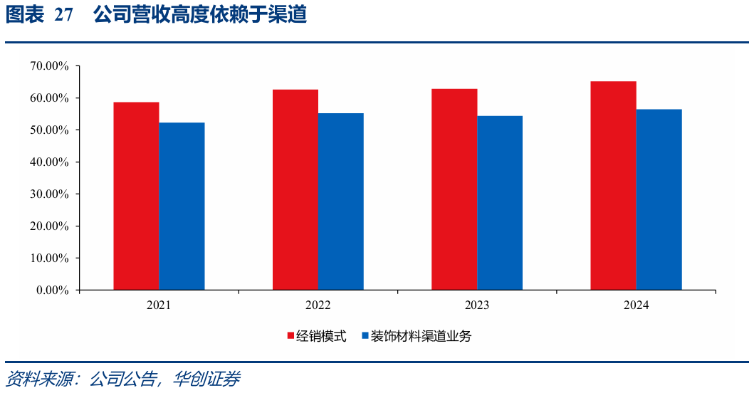 板材销售本质上是一门依靠渠道的生意,渠道建设实现市场覆盖。1)由于板材产品标准化程度高,属于低频次、高介入度的采购行为,其销售严重依赖终端网点的广泛布局与专业服务能力,尤其在下沉市场中,经销商在当地的知名度,其在熟人经济特征下能发挥的作用力度,直接决定板材销售的市场份额与盈利能力。强大的渠道体系不仅能有效提升品牌触达与消费者信任,更是控制终端、实现规模化销售的关键。2)2021-2024年,公司经销模式与装饰材料渠道业务收入占比持续提升,2024年分别达65%与56%,营收高度依赖于渠道。