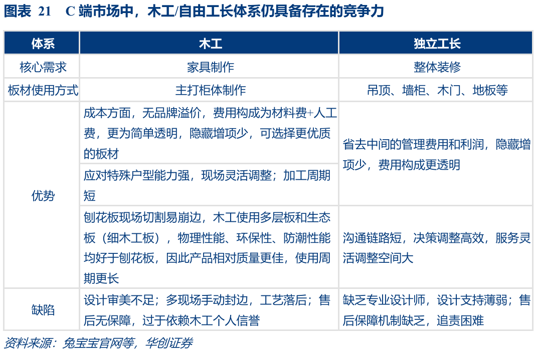 木工/自由工长体系仍具备继续存在的竞争力,C端市场不会消失,乡镇渠道中会更活跃。传统木工/自由工长体系在成本、灵活服务、材料质量等方面具备优势,在对价格更敏感、材料要求更高、服务方式需更灵活的消费群体中更具竞争力,随着全屋定制概念深入发展,C端市场将逐步下沉,依赖木工手动打制家具、个体施工队装修的消费场景不会消失,尤其在乡镇渠道中仍将活跃。此外,C端市场中减少的木工/自由工长体系并不是直接消失,而是通过规模化、组织化,形成新的中小型家具厂/家装公司,依赖人工的根本性质没有变,更钟爱胶合板的事实也没有变。