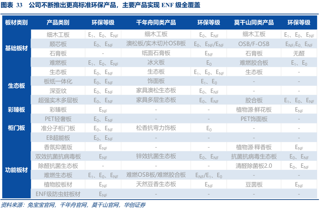 兔宝宝品牌以高环保著称,产品环保性能优于同行。国内人造板环保认证已形成以甲醛释放量为核心的E1级(≤0.124mg/m³)、E0级(≤0.050mg/m³)及最严苛的ENF级(≤0.025mg/m³)三级体系,构成金字塔式的分级标准,ENF级已成为头部企业产品升级与技术竞争的核心指标。2023年起,兔宝宝率先实现全系产品ENF级全覆盖,环保性能显著优于千年舟、莫干山等友商同类产品。