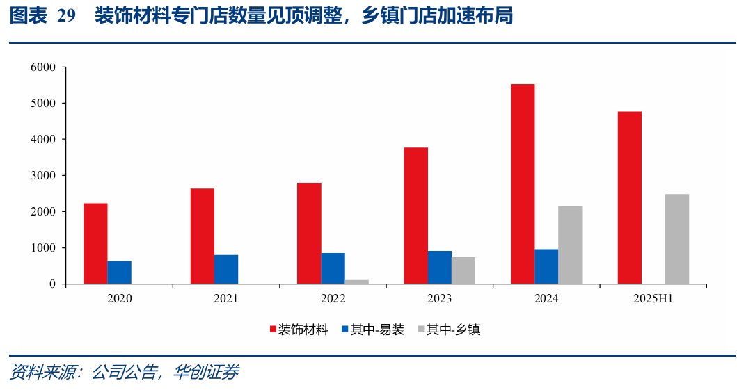 针对当前零售场景更活跃的乡镇渠道,兔宝宝加速线下专卖店建设。零售场景包含C端市场和小B端中未被渠道化的市场,这类场景在乡镇渠道中更为活跃,是兔宝宝中长期内要重点攻克的下沉市场增量。因零售场景更依赖线下门店,兔宝宝持续加速线下专卖店建设并逐步取得显著成效,2024年公司线下专卖店数量见顶达5522家,2020-2024年CAGR达25%;2025年上半年淘汰部分装饰材料门店,专卖店建设重心转向乡镇渠道趋势明显,6月末乡镇门店已达2481家,占装饰材料专卖店数量的52%。