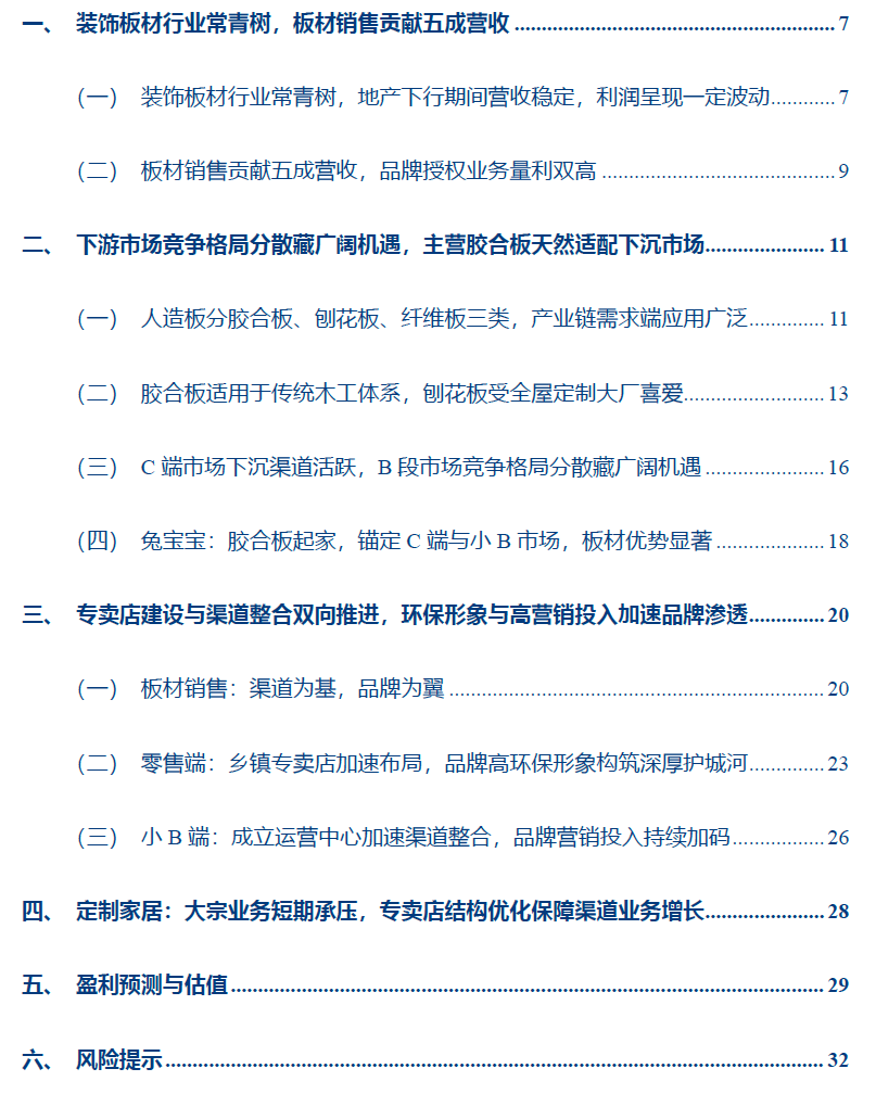 渠道布局成效不及预期:零售端线下专卖店建设质量、小B端渠道整合速度等不及预期,将影响公司核心板材销售业务营收规模增长。