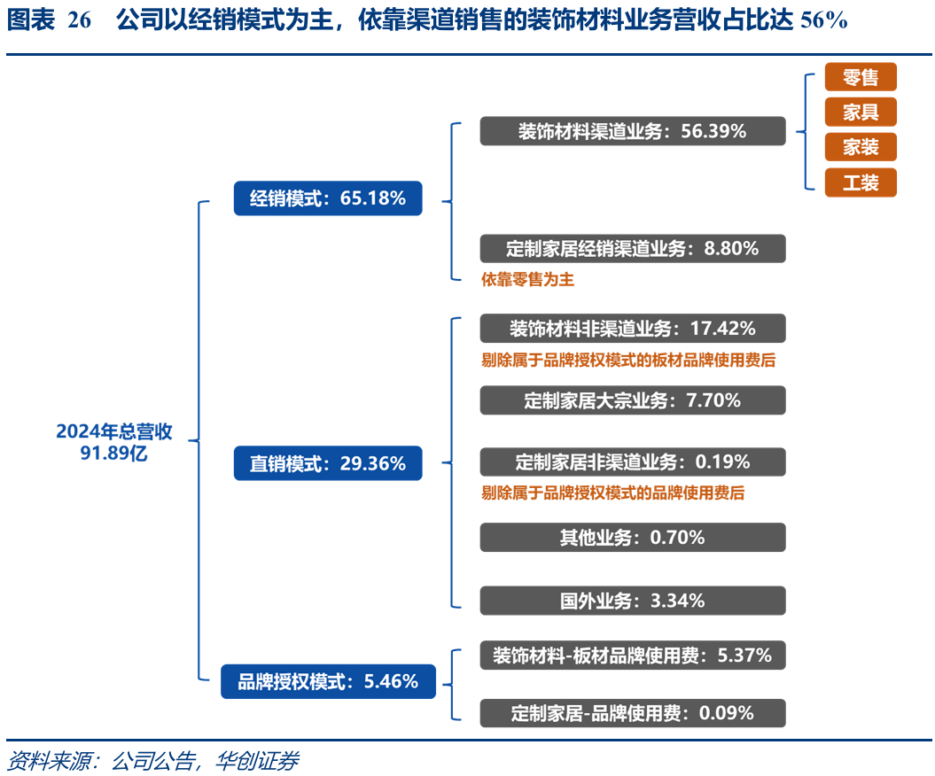 公司业务以经销模式为主,装饰材料、定制家居的渠道业务均属于此类模式。公司的销售模式主要分经销模式、直销模式和品牌授权模式三种,其中经销模式依靠全国范围内庞大的经销商营销网络体系和线下专卖店体系展开,公司建立完整、全面的经销商制度进行管理;直销模式指公司凭借业内的品牌积累,对部分稳定客户直接供货或服务;品牌授权模式即收取品牌授权使用费。三种模式中,经销模式是公司营收主体,2024年占总营收的65%,包含装饰材料和定制家居的渠道业务,其中前者分零售、家具、家装和工装四类渠道,后者主要依靠零售;直销模式的主要构成为装饰材料的非渠道业务和定制家居的大宗业务,后者形式为兔宝宝直接对接地产商提供大批量装修服务,此外的定制家居非渠道业务、其他业务、国外业务均可认定为直销。