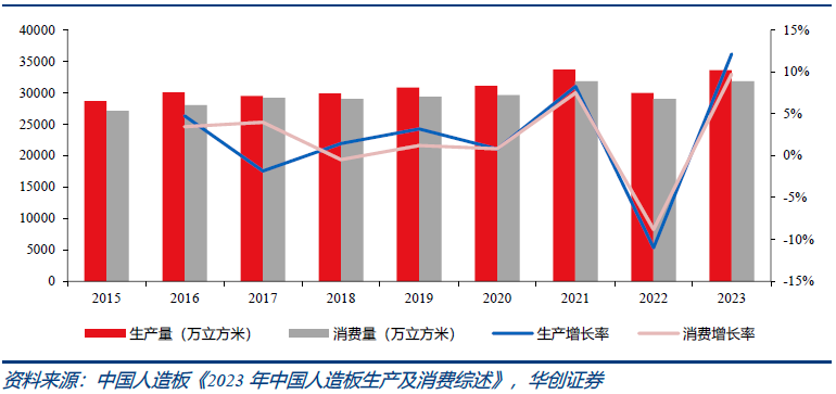 我国是人造板产销第一大国,人造板产销规模总体呈现增长趋势。2022年,疫情爆发对世界经济的冲击持续显现,国内外供应链阻碍未完全打通,人造板行业因上年度建设项目延宕影响而产销水平略有下降,但2023年重新回归增长区间,产量/销量同比增长12%/10%,预计之后仍会稳健增长。