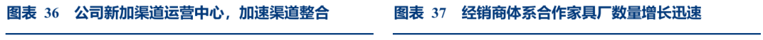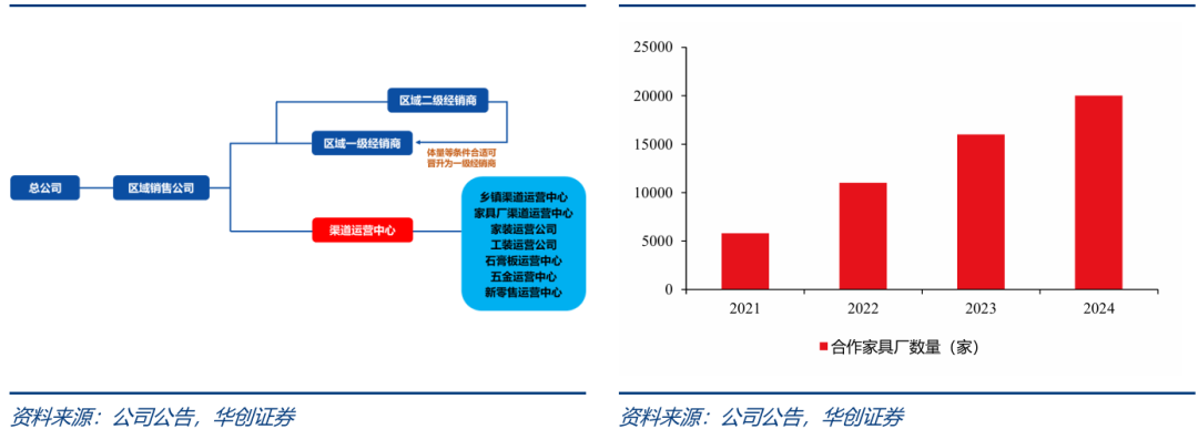 小B端消费场景终止于经销商而不依赖于线下门店,公司变革经销商体系直接对接小B渠道,加速渠道整合。应对市场渠道独立化要求,公司持续推动渠道运营变革,在原经销商体系中区域销售公司下,新加渠道运营中心,与区域经销商并列,具体包含乡镇渠道、家具厂渠道、家装运营、工装运营等中心,为各市场的多渠道业务发展赋能。2024年,公司经销商体系内合作家具厂数量已达20000多家,增长迅速。