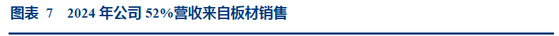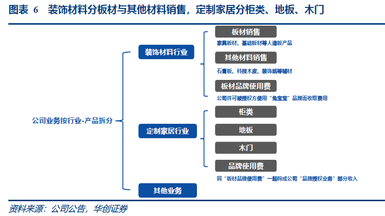 板材销售为公司主业核心,其他材料销售、定制家居、品牌授权等业务多元创收。1)按具体产品划分,公司装饰材料业务主要划分为板材销售与其他材料销售,其中板材销售即为家居板材、基础板材等人造板产品销售,其他材料包括石膏板、科技木皮、装饰纸等辅材;定制家居业务的产品形态为柜类、地板、木门。2)除具体产品外,公司营收还包括品牌授权使用费,即公司将与“兔宝宝”相关的品牌商标等授权给部分工厂使用,并向他们收取费用。3)板材销售是公司的核心业务,2024年公司板材销售营收规模占比达52%,其次是其他材料销售,营收规模占比达23%。定制家居则以柜类产品为主,2024年占营收比重为14%;品牌授权费为6%。