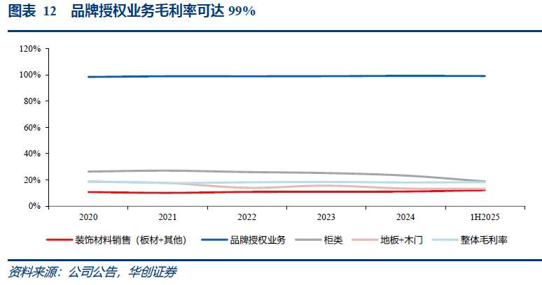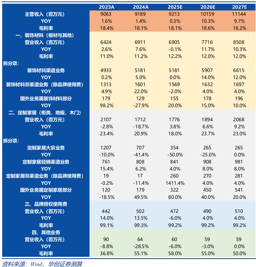 品牌授权业务:毛利率稳定,规模增速与装饰板材销售体量相关性高,预计2025-2027年营收增速为-6.0%、4.0%、4.0%,毛利率均为99.2%。