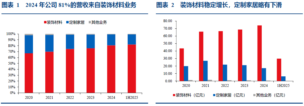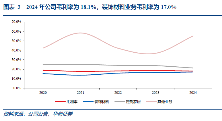 公司业务分装饰材料和定制家居两大块,装饰材料占比高且规模稳定增长,但毛利率较定制家居更低。1)按行业划分,公司业务分成装饰材料、定制家居、其他业务三部分,其中装饰材料业务为公司传统深耕主业,定制家居业务为公司向下游家居市场外拓的尝试。2021年以来,随着房地产市场步入下行期,受地产勾连更重的定制家居业务逐步缩减,2024年占公司总营收的19%,装饰材料业务为81%。2)公司近五年装饰材料营收规模逐年增长,2024年达74.04亿元,2020-2024年CAGR达14%。定制家居业务自2021到达峰值26.87亿元后逐年减少,2024年为17.20亿元,同比减少19%。3)2024年公司毛利率为18.1%,其中装饰材料业务为17.0%,定制家居业务为21.26%。公司为装饰板材行业常青树,材料销售定价让利经销商与消费者,而定制家居业务覆盖下游家具制造环节,可发挥自有供应链优势,因而可以实现高于装饰材料业务的毛利率。