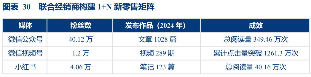 市场流量碎片化、线上化,年轻消费力量提升,公司积极赋能经销商门店,升级新零售营销模式。为补充线下门店在线上营销的空白,公司联合经销商构建1+N新零售矩阵,在天猫、京东、抖音、小红书等电商/新媒体平台上,运用多种形式为经销商门店引流、获客,积极加强线上渠道营销赋能。