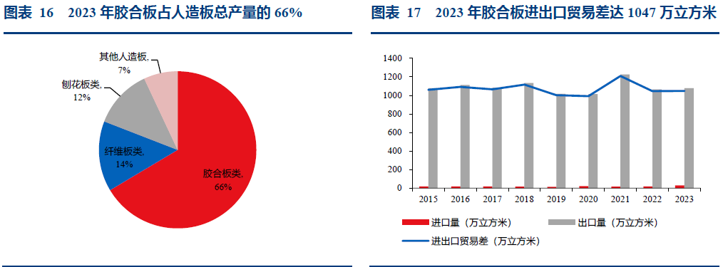胶合板物理性能最优,在传统的木工体系中使用更广泛。三大板材因原材料物性差异而呈现出不同性能特征,并在下游应用领域形成差异化定位。从胶合板、刨花板到纤维板,制造原材料由单板向刨花再向纤维演进,其物理性能整体递减:原材料形态越接近原木,板材在强度、稳定性、重量、握钉力、环保性(胶含量低)及防潮性能等方面表现越优。由此,胶合板在性能上普遍优于刨花板与纤维板,而在传统的木工体系与家具厂中,人工加工的性质决定了其使用胶合板偏多。此外,由于防潮性能领先于刨花板和纤维板,南方的家居市场中胶合板使用率更高。综上,胶合板历来是我国人造板中份额最高的品类,且常年处于贸易顺差。2023年,我国胶合板生产占人造板总产量的66%,进出口贸易差达1047万立方米。