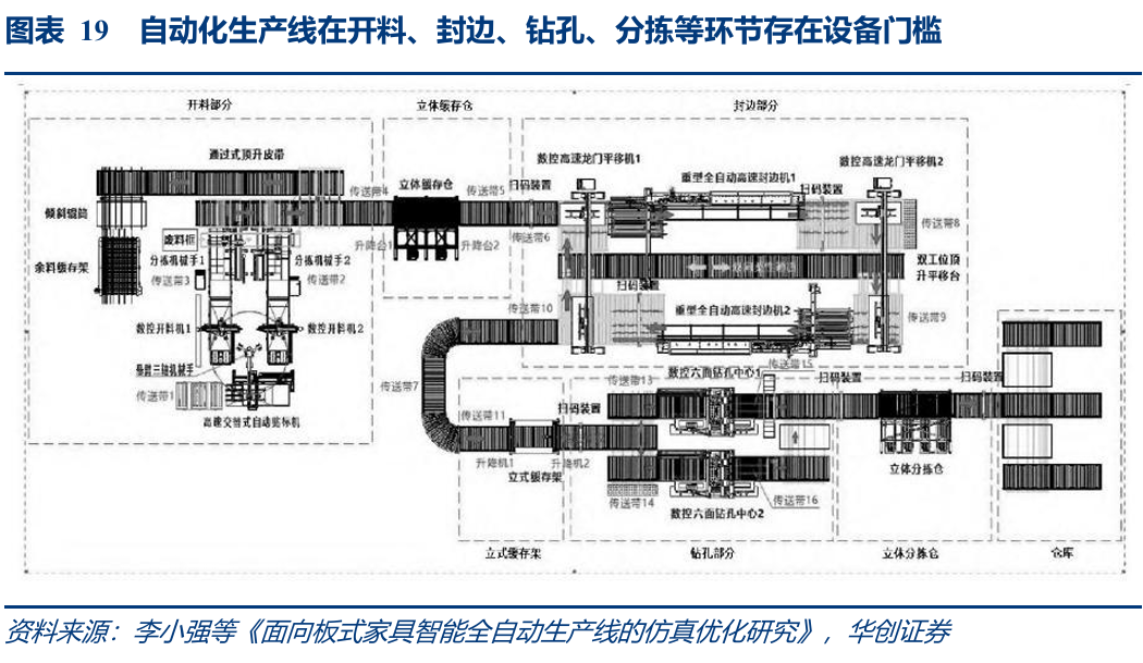 刨花板因价格低且更适用于规模自动化生产而受到全屋定制大厂偏爱。索菲亚、欧派等全屋定制龙头企业已逐步迈入板式家具自动化生产的工业4.0时代,在规模化优势下,刨花板价格便宜,且本身物性因结构更均匀、密度稳定、质量更轻而使自动化加工切割稳定、封边精准、搬运方便,因而受到定制家居大品牌的偏爱。此外,板式家具自动化生产线在开料、封边、钻孔、分拣等环节存在较高的设备门槛,如开料或钻孔环节的高端加工机床设备价格动辄上百万元,因此中小家具厂通常不具备购买该类自动化生产线设备的能力,二者因规模化程度不同而在板材使用上存在根本分野。