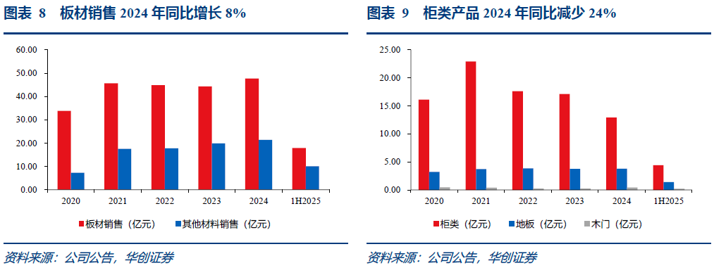 板材销售规模趋于稳定,其他材料销售规模稳步增长。1)2024年公司板材销售48亿元,同比增长8%;其他材料销售收入稳步增长,2024年达21亿元,2020-2024年CAGR达31%。2)定制家居业务发展承压,重点表现为柜类产品营收规模下滑,2024年柜类营收13亿元,同比减少24%。