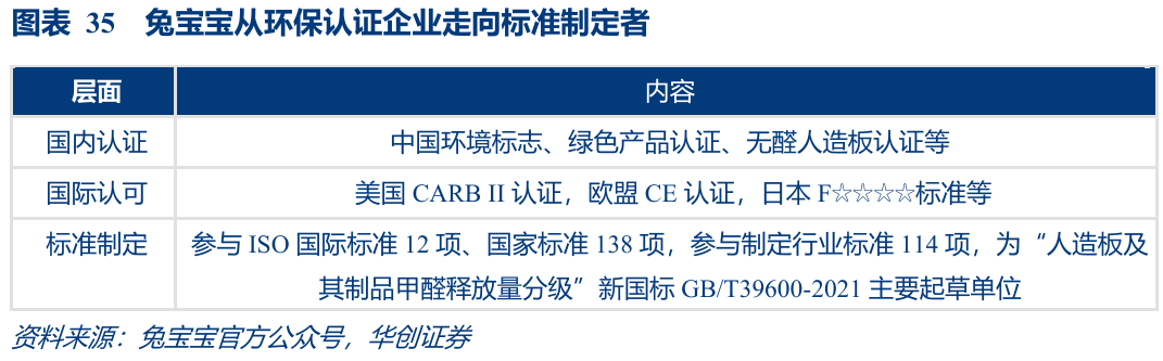 兔宝宝向来是行业环保先行者,品牌高环保形象已经市场验证。公司自2001年率先推出E1标准产品后,持续进行环保技术迭代,陆续推出E0级、无醛级、除醛抗菌及负离子等功能性产品,精准把握环保需求崛起趋势。市场认可度方面,公司已从环保认证的追随者逐步迈向行业标准制定者,深度参与包括ENF级新国标在内的多项国家级标准起草,构筑起坚固的技术壁垒与品牌护城河,其环保领先地位已成为驱动终端销售的核心竞争力。