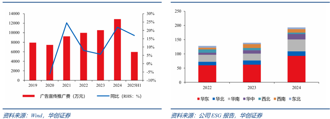 品牌势能突出,零售端凭借高端环保形象积累消费者信任,小B端凭借信任背书与稳定供应链发挥品牌对合作粘性的强化作用。1)在2023年起,兔宝宝率先实现全系产品ENF级全覆盖,环保性能显著优于千年舟、莫干山等友商同类产品。2)公司已从环保认证的追随者逐步迈向行业标准制定者,深度参与包括ENF级新国标在内的多项国家级标准起草,构筑起坚固的技术壁垒与品牌护城河。3)2020-2024年,公司广告宣传推广费持续增加,加速市场品牌知名渗透的同时增强对小B公司的背书能力,并以稳定供应链不断加强对B端的赋能价值,2022年来公司装饰新材供应商数量稳定增加。