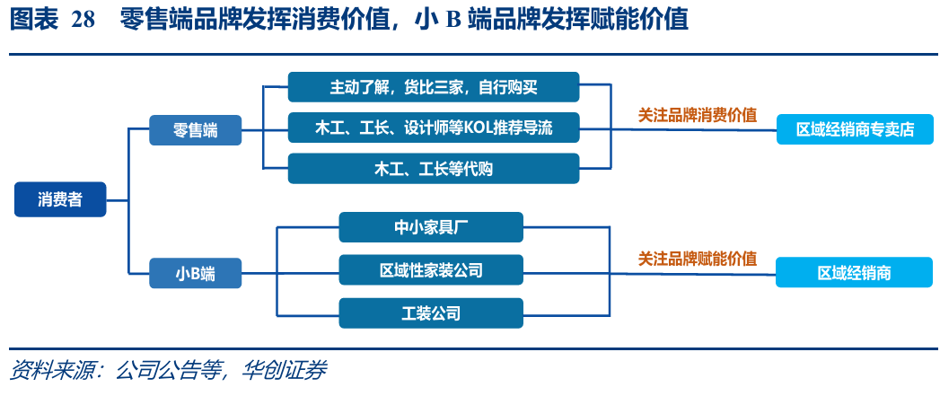 在渠道保障市场渗透之上,品牌力得以发挥,优质的品牌可以创造板材销售的客户价值增量。以公司装饰材料渠道业务的渠道类型为例,消费者可通过零售端与小B端两类途径购买板材,零售端,消费者基于自身需求,可能选择自己主动了解板材差异,货比三家后自行购买,亦或者依赖传统的木工、自由工长、设计师等KOL推荐甚至直接让其代购板材。在这种消费场景下,消费者的消费终点通常为区域经销商的线下专卖店,公司品牌可以凭借消费者关心的环保性、质量稳定等消费价值收获消费者信任。小B端,消费者直接接触中小家具厂等小B公司解决自身板式家具制作等需求,此时消费终点转向小B公司与区域经销商的直接接触而不依赖于线下门店,公司品牌可凭借小B公司更关心的品牌背书、稳定供应链保障等赋能价值加强双方合作粘性。
