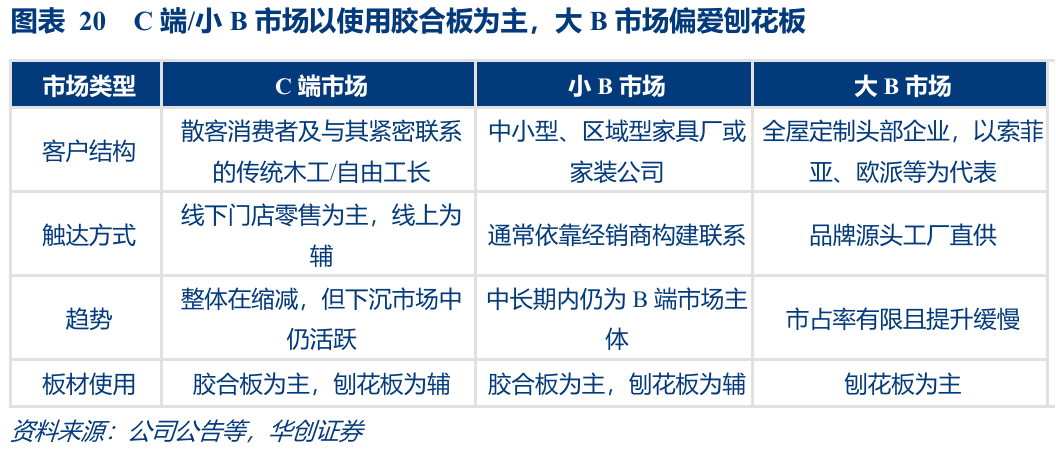 公司业务主体为装饰板材销售,该类业务产业链下游涵盖家具及家装企业,按终端客户属性可划分为三类市场:以散客消费者或木工与自由工长为主的C端市场、含中小型或区域型家具厂和家装公司的小B市场以及以大型全屋定制品牌为主的大B市场。三类市场特征差异明显:1)C端市场:依托传统木工与自由工长体系,熟人经济特征显著,专卖店与线下触点作用突出,下沉市场活跃度更高。2)小B市场:本质为规模化、组织化的木工与工长体系,与经销商接触更频繁,当前仍在大家居市场中占据主导地位。3)大B市场:已逐步实现板式家具机械化、智能化生产,偏爱使用刨花板,以头部企业索菲亚、欧派为代表但整体市占率仍有限。