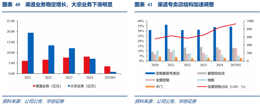 公司定制家居渠道业务以零售为核心场景,增长稳定性更优。按渠道拆分,公司定制家居业务承压主要由于大宗业务收入下滑明显,2024年公司大宗业务营收7.07亿元,较2021年峰值已收缩64%;渠道业务稳定增长,2024年为8.08亿元,同比增长6%。2020年至今,公司定制家居类专卖店总数小幅波动,2024年达848家;门店结构不断优化,全屋定制类门店占比逐年提升,2025年上半年已达37%,较2020年增长15pcts,预计未来将继续推动渠道部分收入稳步增长。