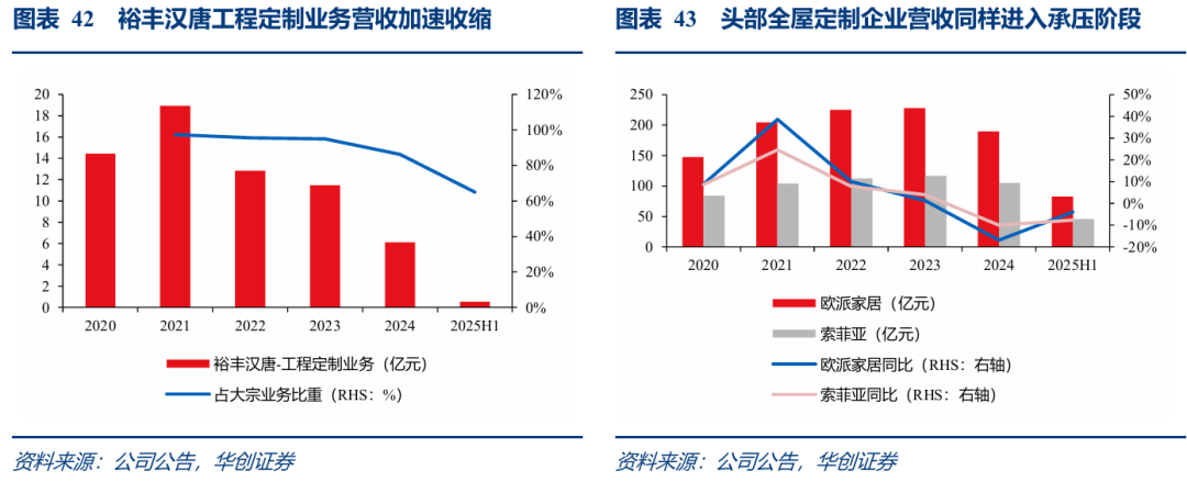 大宗业务与房地产市场关联大,营收规模回暖依赖于地产复苏。裕丰汉唐作为公司旗下定制家居工程业务的承担主体,近年来主动控制营收规模以降低风险,逐步转换业务中心至优质地产客户。2024年,裕丰汉唐工程定制业务营收6.1亿元,较2021年峰值18.94亿元收缩68%。同年,头部定制家居企业营收同样进入承压阶段,欧派家居/索菲亚营收同比下降17%/10%,预计大宗业务走出下行期依赖于地产复苏。